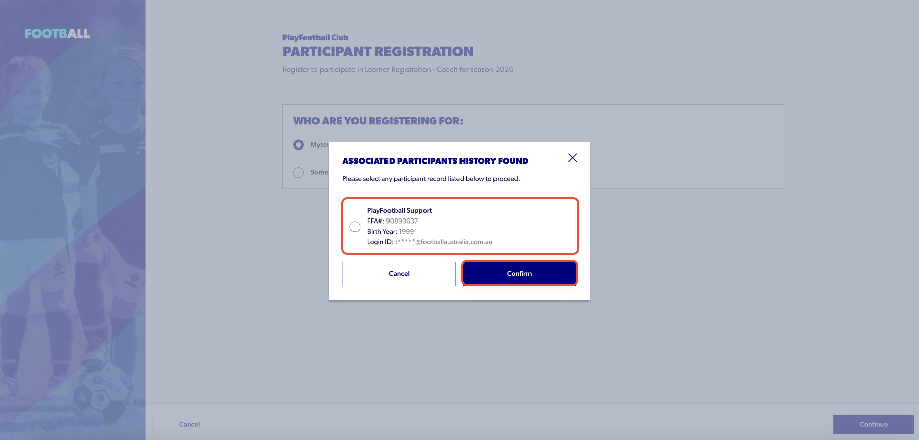 6. Select the person who is being registered and select ‘Continue’ and the bottom of the page.