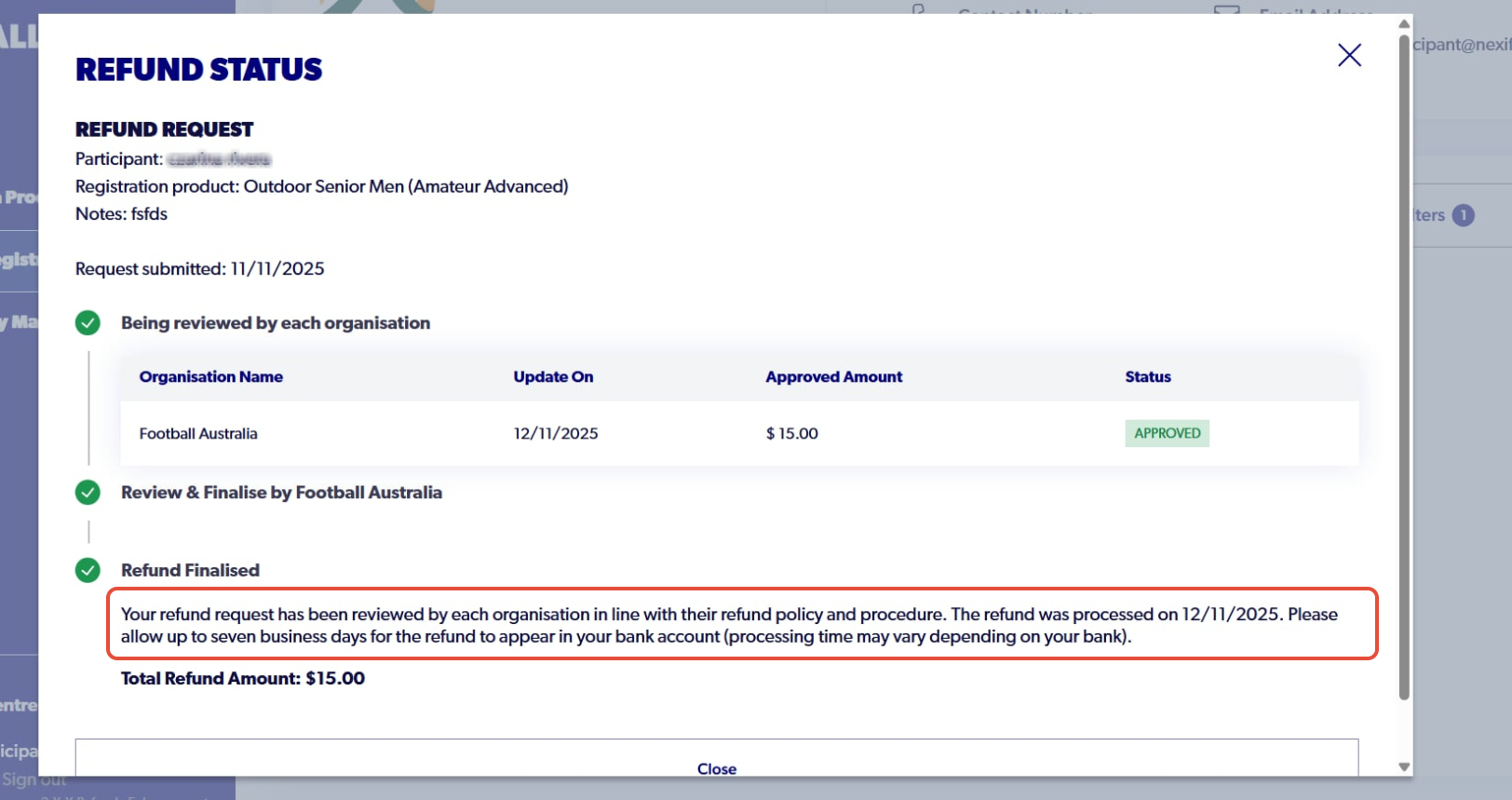 - Updated Finalised Message Text to show the date processed by FA and allow up to 7-business-day for the refund to appear in bank account